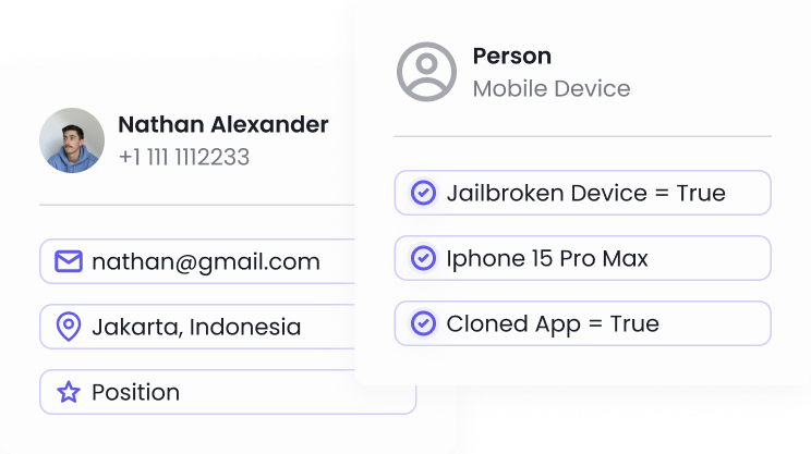 Combines device metadata, IP reputation, biometric signals, and user interactions to build a complete fraud risk profile.